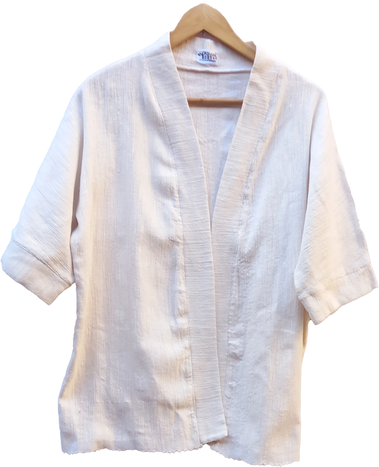 This elegant handwoven kimono, crafted from hand-spun cotton, radiates a timeless charm. Its natural white, ivory-toned hue captures the essence of simplicity and purity, offering a serene and graceful appearance. The delicate texture of the fabric speaks to the care and skill invested in its creation, blending artisanal techniques with classic design. Lightweight and breathable, this kimono is perfect for those who appreciate understated sophistication and the beauty of handcrafted traditions. A truly versatile piece, it embodies both heritage and elegance.