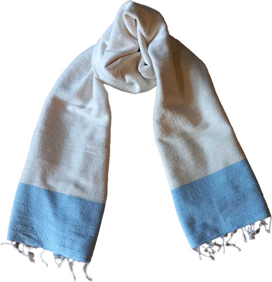 Crafted with care and tradition, this exquisite hand-woven scarf is made from soft, hand-spun cotton, offering a gentle, breathable feel perfect for any season. The delicate weave showcases expert craftsmanship, creating a timeless accessory that complements any outfit. Its fringed edges add a subtle touch of charm, while the refined design allows for effortless styling. Simply drape the shawl over your shoulders for an effortlessly elegant look. Perfect for formal occasions or cool evenings.Available with a classic white body and a choice of either a striking blue or refreshing lemon-colored edge, this shawl is a versatile addition to your wardrobe, celebrating artisanal heritage with every thread.